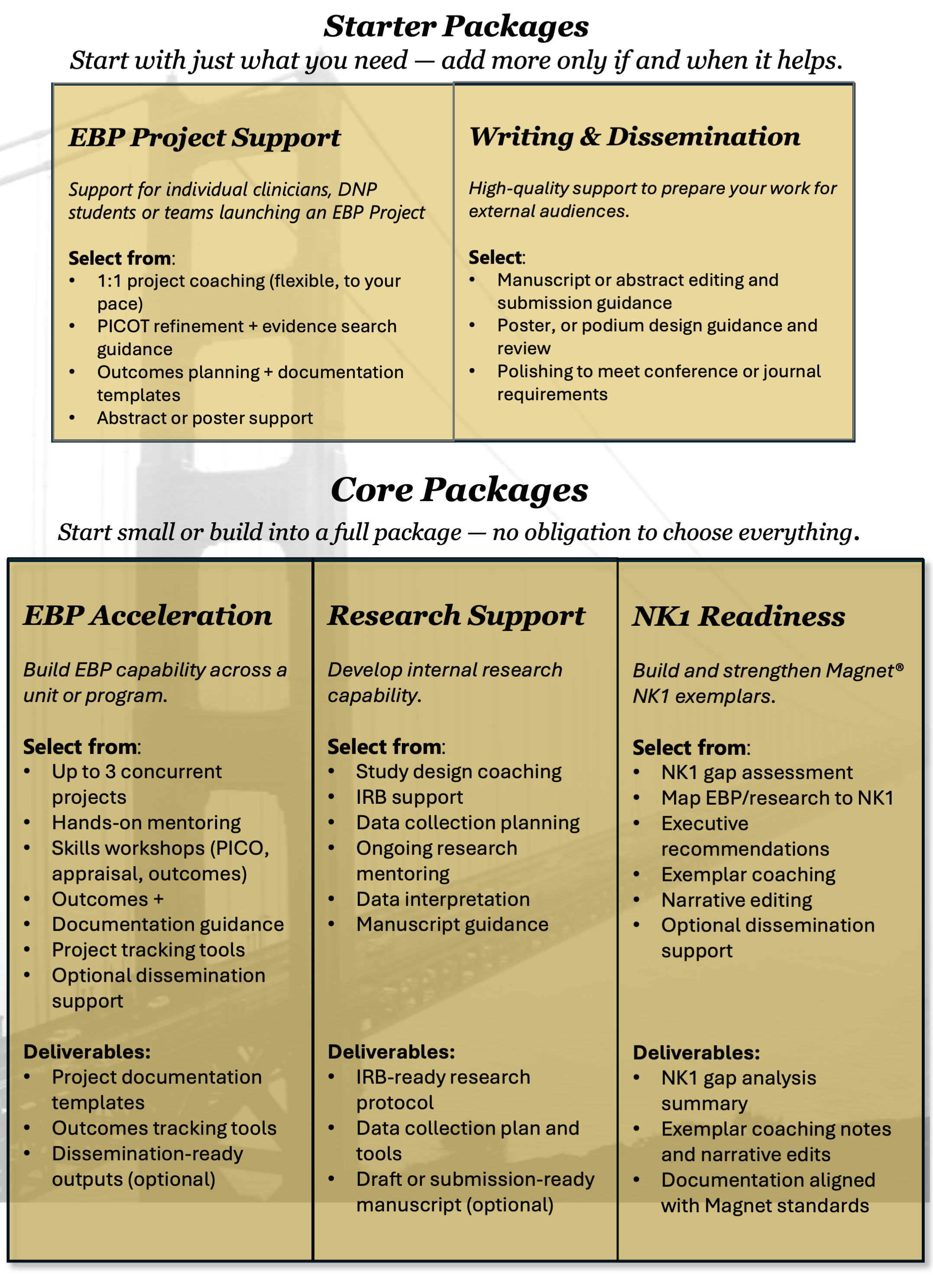 We help nursing leaders and organizations succeed in the Magnet® Recognition Program, with targeted expertise in the New Knowledge, Innovations, and Improvements (NK1) domain. Our services include evidence-based practice consulting, nursing research support, and dissemination coaching—tailored to help your teams move from ideas to measurable outcomes.